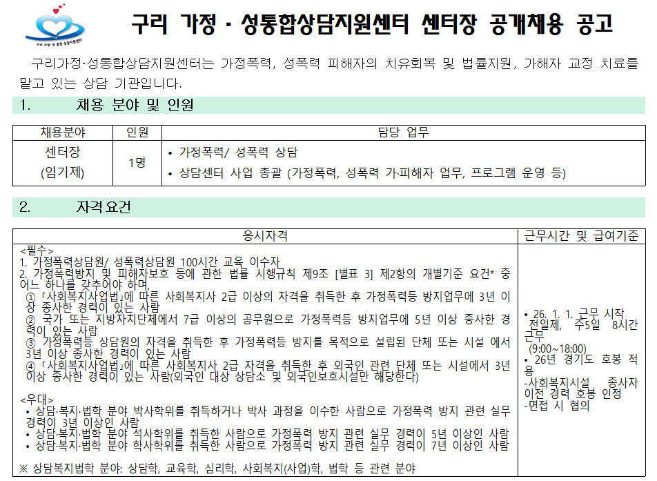 [채용]구리 가정·성통합상담지원센터 센터장 공개채용 공고